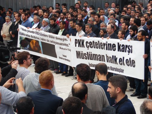 Eylemde ölen insanların fotoğrafları taşınırken sık sık “Kahrolsun PKK, İşbirlikçi Medya, İslami Hareket Engellenemez” şeklinde sloganlar atıldı.