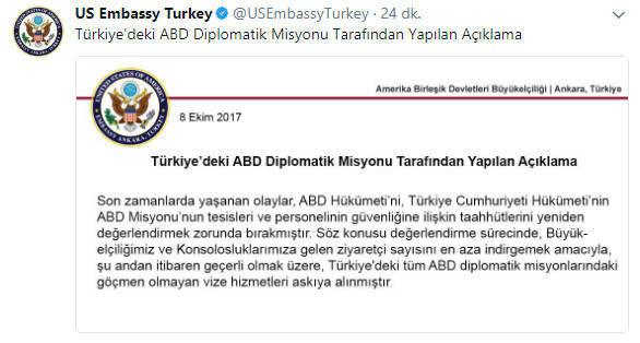 ABD Büyükelçiliği bu değerlendirme sürecinde konsolosluklarımıza gelen ziyaretçi sayısını en aza indirmek amacıyla vize başvurularının askıya alındığını duyurdu.
