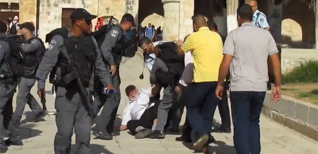 Avludaki Filistinliler darp edilerek dışarı çıkarıldı onlardan biri yaşlı bir Filistinliydi. Namaz için Mescid-i Aksa'da bulunan Filistinli adam, İsrail askerleri tarafından dövülerek dışarı çıkarıldı. 10'a yakın İsrail askeri, namaz kılmasını engelledikleri yaşlı adamı cop ve tekmelerde dövdü. Şok görüntüleri birkaç metre uzakta bulunan biri cep telefonuyla kayda alarak internete yüklendi.