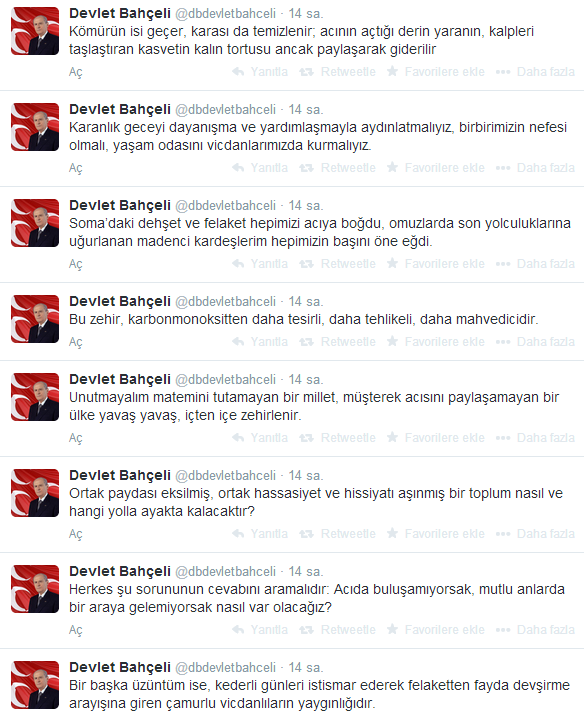 Devlet Bahçeli Soma'daki maden faciasında çalışmaların tamamlanmasının ardından görüşlerini Twitter üzerinden takipçileri ile paylaştı.