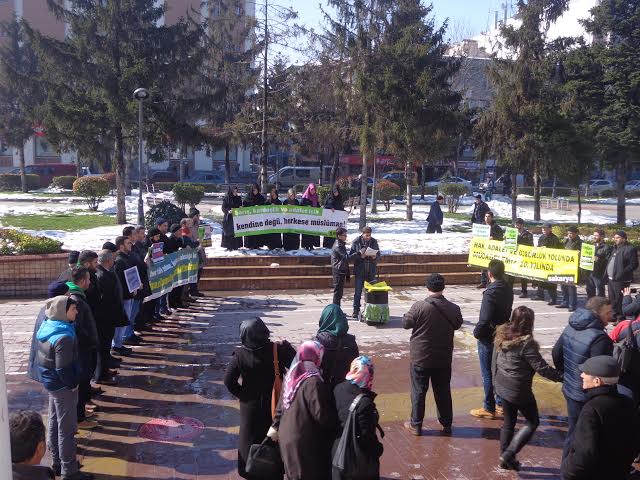 Sakarya Adalet ve Özgürlükler Platformu, 493. hafta eyleminde basın açıklamasını Sakarya Dayanışma Derneği’nden Erhan Duru okudu. Özgecan Aslan’ın hunharca katledilişi üzerinden “şiddet”in ele alındığı açıklamada, “Televizyon/magazin kültürünün kadını metalaştıran, piyasalaştıran tutumu; ‘Evlat, Kardeş, Yoldaş, Eş, Ana’ olarak değil sadece ‘kadın’ olarak; hayatın içinde salt cinsel kimliği üzerinden tarif edilmesi ve bunun kitleselleşmesi, kadının bu tek katlı kimlik üzerinden algılanmasına ve örselenmesine yol açıyor. Ancak bu durum karşısında bizatihi kadını suçlayan, ahlaki çöküşü kadına bağlayan görüşü de kabul etmemiz mümkün değil. Zira bu toplum sadece kadınlardan oluşmamasına rağmen çöküşün faturası tek başına kadınlara çıkartılıyor” ifadelerine yer verildi.