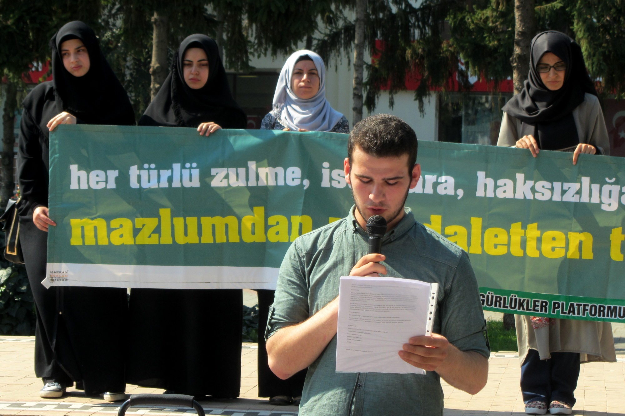 Kurban Bayramı’nda işgal altındaki Filistin topraklarında gerçekleşen Mescid-i Aksa baskınları, Suudi Arabistan’daki facia ile Yemen’deki intihar eylemi de gündeme getirildi. Açıklamada, “Kudüs’te Mescid-i Aksa’da siyonist çetenin zulmü kan dökmeye devam ederken, Suudi işgali altındaki Mekke’de de, arka arkaya yaşanan iki ihmal vakası sonucu yüzlerce Müslüman hayatını yitirdi. Bunca acının yanında yine bayram sabahı Yemen’in başkenti Sana’da bayram namaz için toplanan Şii halka ait bir camiide İŞİD tarafından yapılan bombalama olayı da, bu bayramın kahredici bir diğer olayı idi. Yakamızı bırakmayan bunca felaketin, İslam coğrafyasındaki bunca acı zulüm ve şiddetin sorumlusu maalesef öncelikle bizlere ve İslam dünyasının yöneticilerine aittir. Halklarına barış, huzur ve güvenlik sağlayamayan iktidarların hiç bir özrü, “dış güçler bölgemizi karıştırıyor” mazereti kabul edilemez. Eğer İslam toprakları bu kadar kolay karıştırılabiliyorsa bunun sebebi de şüphesiz bölge ülkelerinin yöneticileri-iktidarlarıdır.” İfadeleri kullanıldı. Eylem, dua ile son buldu.