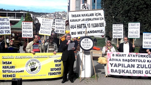 Basın açıklaması sırasında karşı tarafta bulunan CHP binasından müzikli tacizle, açıklamayı bastırma girişimine rağmen, basın açıklaması yapıldı. Kocaeli İnanç Özgürlüğü Platformu 8 Mart Dünya Kadın Hakları gününde kadına karşı işlenen fiziksel ve psikolojik şiddetin yanı sıra, 8 Mart açıklamacası sahtekarları da protesto etmek için İnsan Hakları Anıtına siyah çelenk bıraktı. 8 Martta kadına şiddet diyenlerin bu toplumun % 70 inin oluşturan başörtülü kadına karşı işlenen insan hakları suçunun dile getirmemeleri kınandı. İlk öğretin ve liselerde başörtü yasağının Atatürk ilke ve inkılapları ve laiklik bahanesiyle sürdürüğünü belirtilerek 8 Mart Atatürkçülerin başörtü yasağına karşı başkaldırı günü ilan edildi ve başörtülü kadına yapılan zumun anlatılmadığı 8 mart Dünya kadınlar gününün kutlanmadığı belirtildi. Basın açıklamasını İnsan hakları savunucuları Derneği genel başkan yardımcısı Behlül Metin yaptı. Vatandaşlar ellerinde “8 Mart Atatürkçülük adına başörtülü kadına yapılan zulme başkaldırı günü” ,” 8 martta başörtülü kadının adı yok”, “8 Mart'ın üç maymunları yine bizi güldürdünüz” pankartları taşıdılar.