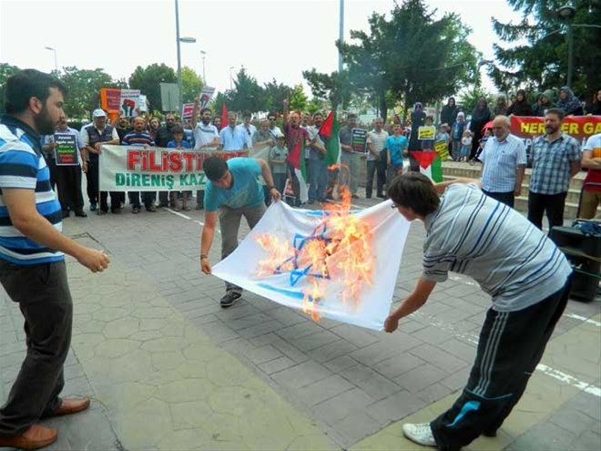 Açıklamanın ardından İsrail bayrağı yakılarak "Özgür Kudüs, İsrailsiz bir dünya", "Katil İsrail, Ortadoğu'dan defol" sloganları atıldı.