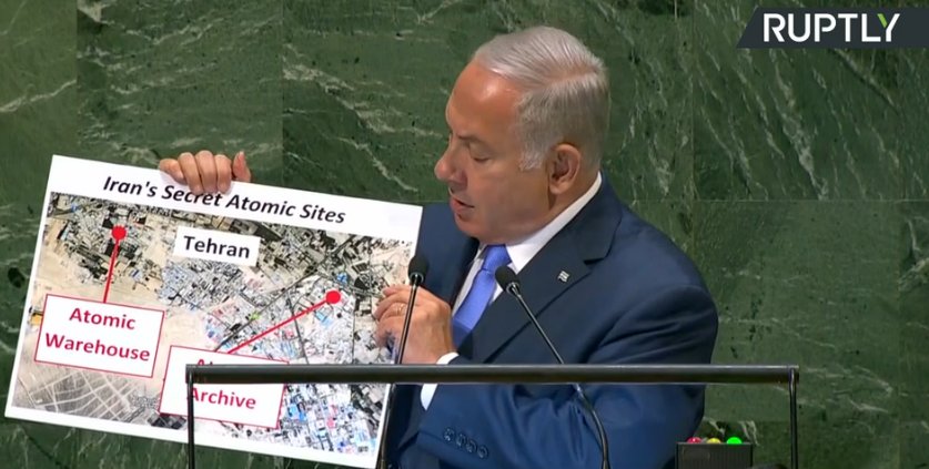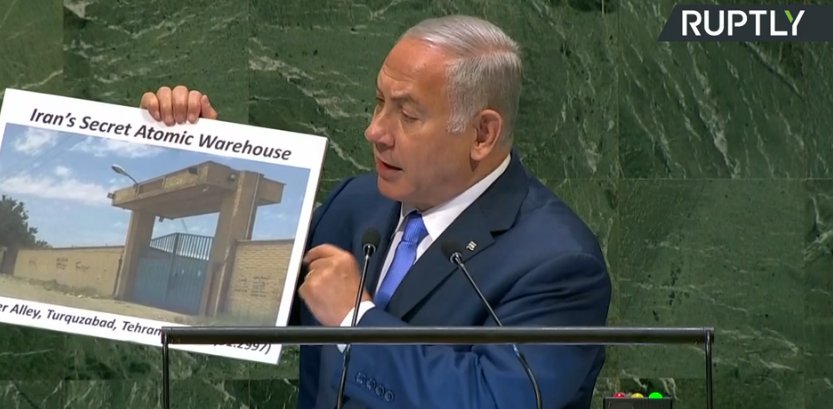 BM Genel Kurulu konuşmasını bu yıl da İran karşıtı kampanyaya çeviren İsrail Başbakanı Benyamin Netanyahu, ''İran'a karşı Suriye, Irak, her nerede gerekiyorsa eyleme geçeceğiz' dedi. Yine elinde fotoğraflarla Tahran'da gizli nükleer tesis iddiasında bulundu.