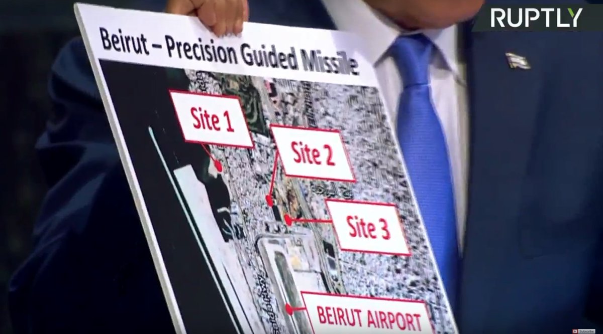 İran'ın Hizbullah'a isabetsiz roketleri İsrail'in içlerini vurabilecek isabetli füzelere çeviren gizli tesisler kurma emrini verdiğini ileri süren Netanyahu, Beyrut'taki bu gizli tesislere ait olduğunu söylediği bir haritayı da çıkarıp göstererek şunları söyledi: