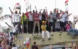 Bir paylaşım sitesinde yayınlanan görüntüde çok sayıda Mısır'lı tankların üzerine çıkarak Canımız, Kanımız Feda Olsun İslam'a nidalarıyla ülkelerine sahip çıktığı paylaşılıyor.