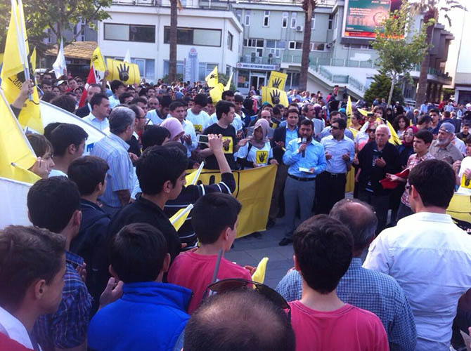 Delikliçınar Meydanı´nda toplanan Memur-Sen, Medeniyet ve İnsani Yardım Derneği ile çeşitli sivil toplum kuruluşu üyeleri, Mısır’daki 529 İdam kararını kınamak için protesto düzenledi.