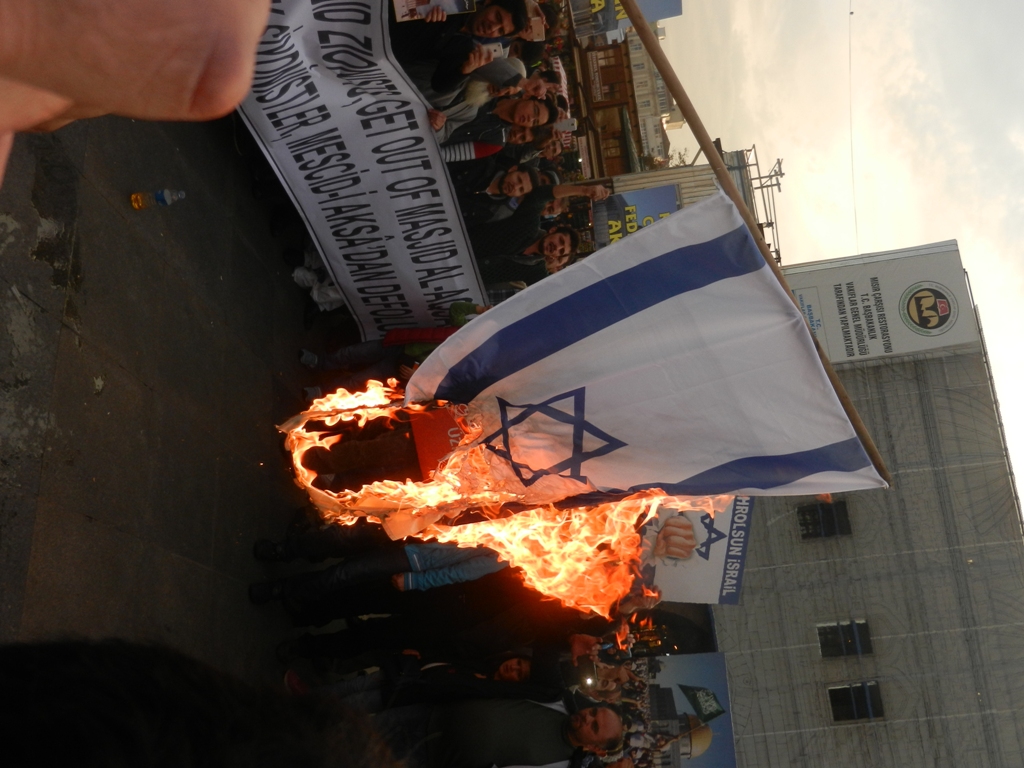 Eylem boyunca pankart ve dövizler taşınırken sloganlar atılıp tekbir getirildi ve İsrail bayrağı ateşe verildi.