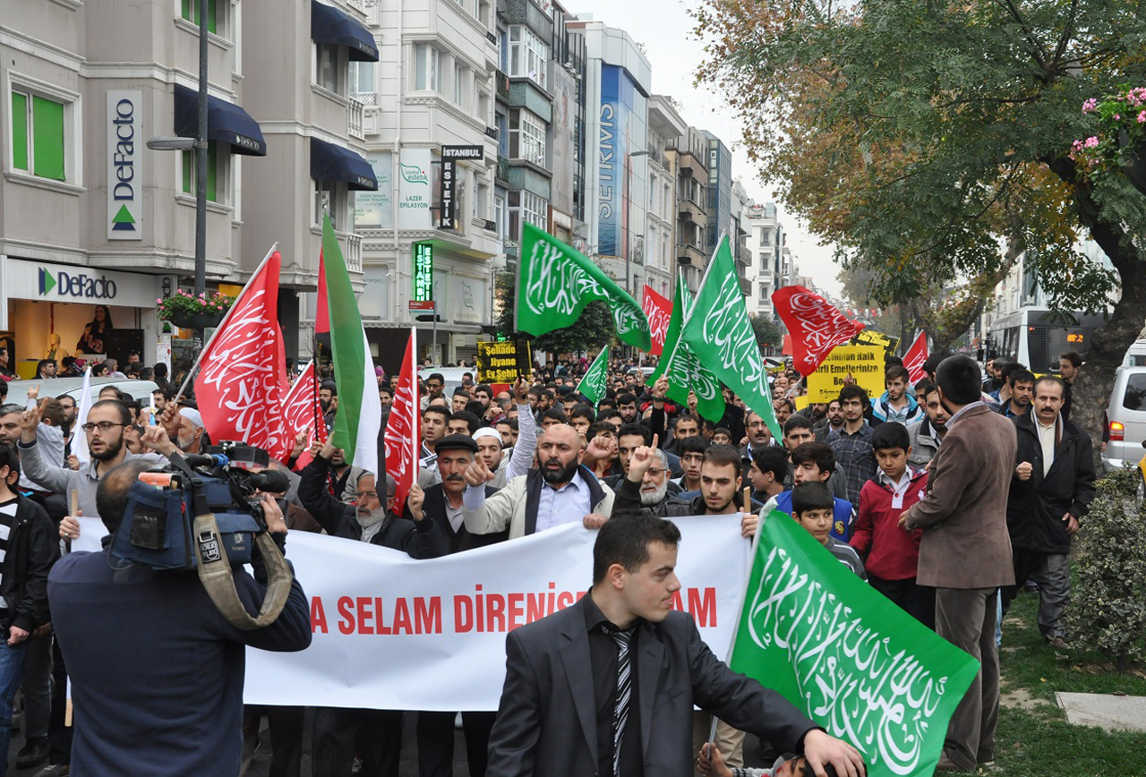 Yürüyüş esnasında “Kahrolsun İsrail, Lailaheillalah İsrail Lanetullah, Lailaheillalah Amerika Lanetullah, Oluk oluk kan aksa Kurtulacak El Aksa, Lailahaillalah Muhammed Resululah” sloganları eşliğinde yürüyen kalabalık grup sık sık tekbir getirdi.