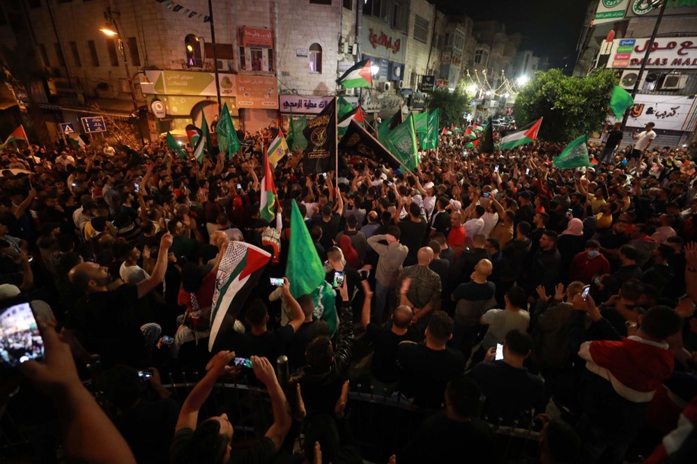 Filistinli gençler, "Ramallah'tan onurlu Gazzemize selam olsun", sloganları atarak zaferden duydukları sevinci ifade etti.
