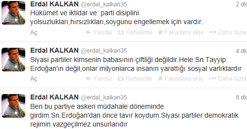 Disipline sevk edilen Bakanlardan Erdal Kalkan da açıklamayı Twitter'dan yaptı. "Ben bu partiye askeri müdahale döneminde girdim.Sn.Erdoğan'dan önce tavır koydum.Siyasi partiler demokratik rejimin vazgeçilmez unsurlarıdır" diyen kalkan, "Siyasi partiler kimsenin babasının çiftliği değildir.Hele Sn Tayyip Erdoğan'ın değil,onlar milyonlarca insanın yarattığı sosyal varlıklardır. Hükümet ve iktidar ve parti disiplini yolsuzlukları,hırsızlıkları,soygunu engellemek için vardır." ifadelerini kullandı.