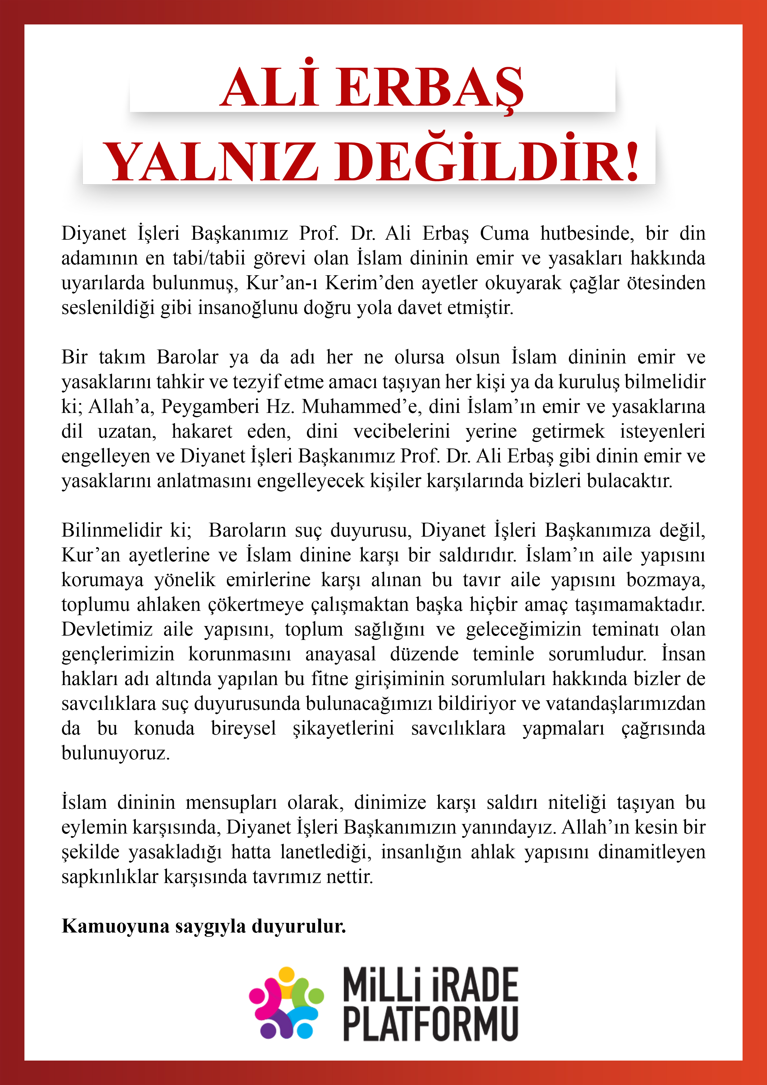 Hükümete yakın sivil toplum kuruluşlarının oluşturduğu Milli İrade Platformu, eşcinsellik sapkınlığına karşı ifadelerinden ötürü hedef alınan Diyanet İşleri Başkanı Ali Erbaş’a destek verdi. Platformdan yapılan açıklamada Ankara Barosu’nun İslam’a hakaretleri de tel’in edildi.