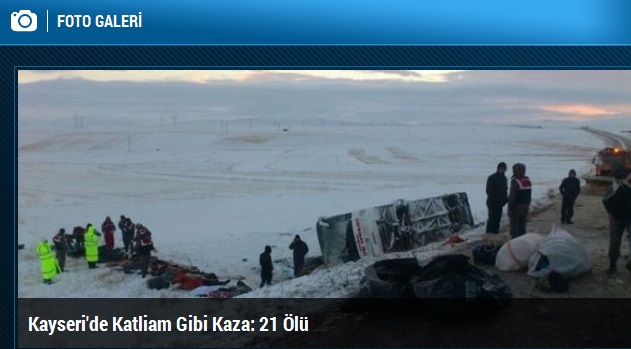Kayseri'nin Pınarbaşı ilçesinde bir yolcu otobüsünün şarampole devrilmesi sonucu meydana gelen kazada 21 kişi öldü, 29 kişi yaralandı.