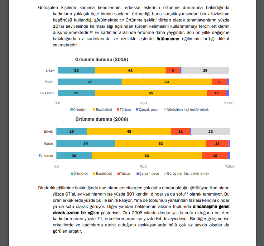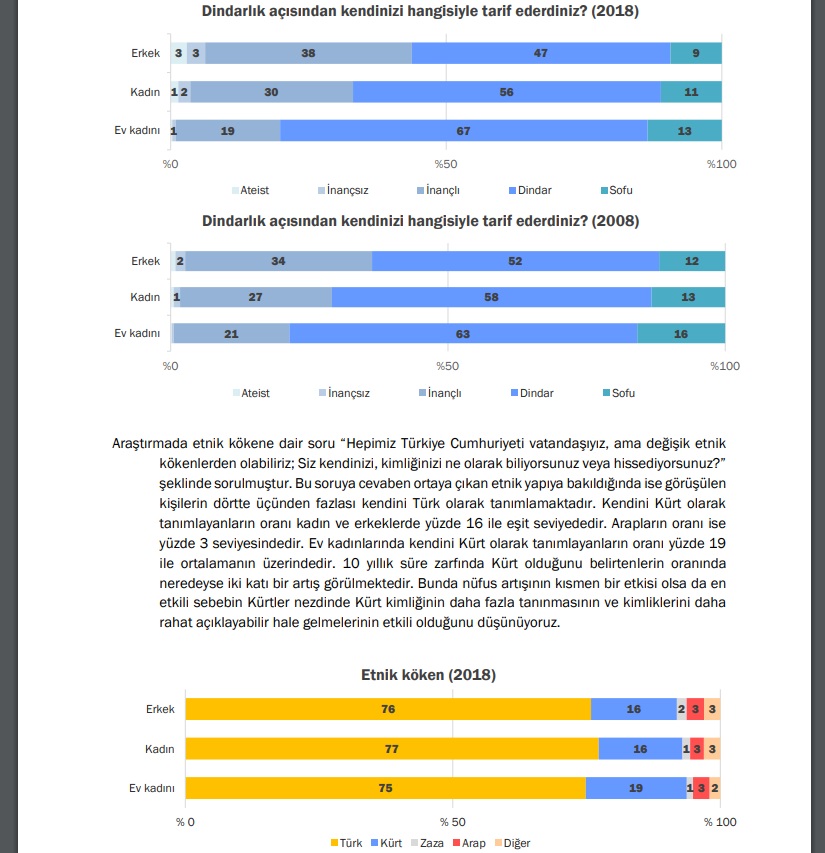 11 sene içinde farklı zamanlarda toplamda 20 bine yakın kişiyle görüşülerek gerçekleştirilen 3 farklı Hayat Tarzları araştırmasının karşılaştırmalı verilerine dayanan rapor Türkiye’de kadınlarla erkekler arasındaki dengesizlikleri çeşitli alanlar üzerinden ortaya koyuyor. Rapor ilk olarak temel demografik farkları ve toplumun toplumsal cinsiyete dair bakışını ele alıyor. Ardından yerleşim, eğitim, medeni durum, yaş gibi farklar üzerinden kadınların ve erkeklerin kamusal alanda yer alma, tüketim, beden ve sağlık, medya ve müzik, din ve değerler açısından kadınlarla erkeklerin nasıl ayrıştığını ortaya koyuyor. Son olarak 9 ayrı hayat tarzı kümesi içindeki cinsiyet farklarına odaklanıyor. Ayrıca, kadınların yarısını oluşturan ev kadınları da raporda ayrı bir konu başlığı olarak ele alınıyor.
