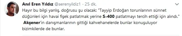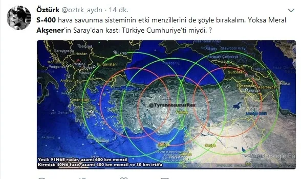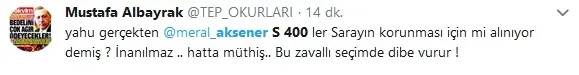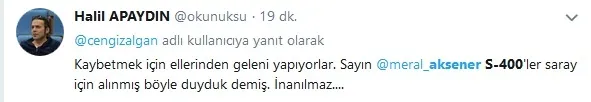 Akşener, S-400'lerle ilgili, "mesela benim bir bilgim var S-400'lerle ilgili. Bir duyum şeklinde. Umarım doğru değildir. Bir güvensizlik neticesinde sarayın korunması için alındığına dair bir duyum aldım. Umarım doğru değildir" şeklinde konuştu.