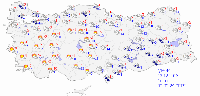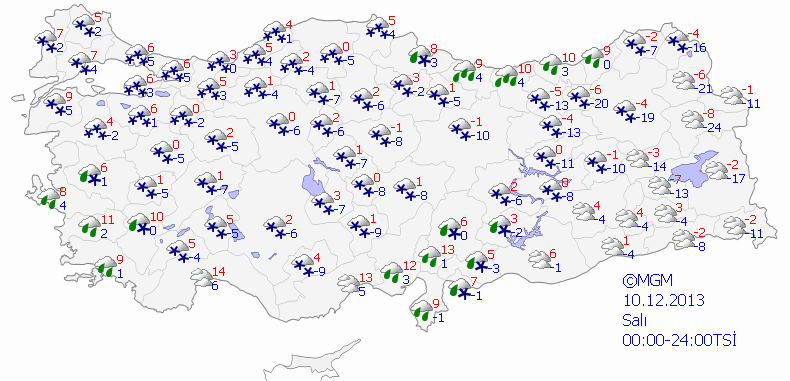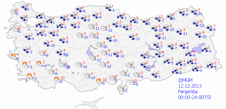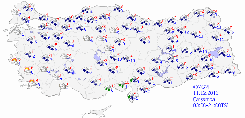 Çarşamba günü; Marmara'nın doğusu, Kuzey Ege, Karadeniz, İç Anadolu'nun güney ve doğusu, Orta ve Doğu Akdeniz ile Doğu ve Güneydoğu Anadolu bölgelerinde yağışbekleniyor. Orta ve Doğu Akdeniz kıyı şeridinde yağmur, iç kesimlerinde karla karışıkyağmur ve kar, diğer yerlerde kar şeklinde görülecek yağışların, Marmara'nın doğusu, BatıKaradeniz, Güneydoğu Anadolu'nun doğusu ve Doğu Anadolu'nun güneydoğusundaaralıklarla kuvvetli olacağı tahmin ediliyor. Rüzgar; Marmara, Batı Karadeniz ve Kuzey Ege'de kuzey ve kuzeydoğu (Poyraz), Orta ve Güney Ege ile Akdeniz'de kuzey yönlerden kuvvetli (40-60 km/s) ve kısa süreli fırtına (50-70 km/s) şeklinde esmesi bekleniyor. Kuzey, iç ve doğu kesimlerde kuvvetli, Ege ve Akdeniz kıyı şeridinde hafif, iç kesimlerinde orta kuvvette buzlanma ve don olayı bekleniyor. Orta ve Doğu Karadeniz kıyıları ile Güney Ege veAkdeniz kıyılarında zirai don olayı bekleniyor.