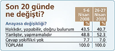 - "AKP, kapatma davası devam ederken, kapatmayı zorlaştıracak bir anayasa değişikliği yaparsa, nasıl karşılarsınız?" sorusuna, katılımcıların yüzde 40.7'si "Haklıdır, yapabilir, doğru bulurum", yüzde 52.3'ü "Yanlıştır, yapmamalıdır" yanıtını verdi. Katılımcıların yüzde 7'si bu soruyu yanıtlamadı.