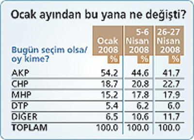 Ankete göre, 22 Temmuz 2007 seçimlerinde yüzde 46.6 olan ve seçimin ardından da yükselmeye devam eden AKP'nin oyları, Eylül 2007'de yüzde 52'ye, Ocak 2008 de ise yüzde 54'lere ulaştı. Ancak, bu tarihten sonra yurtdışı piyasaların etkisi, Türkiye'deki siyasal gerilim ve ekonomik durgunlukla birlikte AKP de kan kaybetmeye başladı.