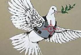 Banksy'nin en büyük derdi savaşlar ve tüketim toplumuyla ilgili. İngiltere'de işlek bir caddenin duvarında polis memurlarını öpüştürmesi de tıpkı elinde çiçek fırlatan protestocu gibi şiddet karşıtlığı özleminin bir yansıması. Barışa dair en büyük eseri ise bugün savaşla anılan Ortadoğu topraklarında. Filistinlilerin karşı çıkmasına rağmen, Berlin'deki yıkılan "utanç" duvarının neredeyse 10 katı büyüklüğünde bir duvarın İsrail-Filistin sınırına inşa edilmesi Banksy'yi de rahatsız etmiş. O ilk defa kendisi için tuval olan bir duvarın yapımına karşı. Elbette protestosunu da kendi diliyle gerçekleştiriyor. Elinde uçan balonlar olan bir kız çocuğu, duvarın "öte" yanına geçebilmeyi simgeliyor. Duvarın "öte" tarafındakilere, her zaman gördükleri şehir yerine bir dağ manzarası sunuyor.