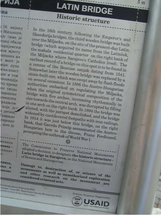 Benim için bu şehirdeki en ilginç olan yerlerden birisi de Latin Köprüsü idi.. Çünkü, 28 Haziran 1914"de, Avusturya Macaristan imparatorluğu Veliahdi Franz Ferdinand ve eşinin, bu şehirdeki İskenderiye veya Latin Köprüsü denilen yerde Gavrilo Princip isimli sırb nasyonalisti bir genç tarafından öldürülmeleri ile, I. Dünya Savaşı"nın patlak vermiştir.. Yani, bu suikasd, muazzam bir cephaneliği havaya uçuran bir kıvılcım mesâbesindeydi ve bir anda, bütün bir Avrupa ve sonra bütün dünya halkları, birbirlerinin boğazına nasyonalist duygu ve ideolojilerle aç kurtlar gibi saldırmışlar ve o savaşta onmilyonlarca insan can vermiş, yıkılan sosyal bünyeler üzerinde en umulmadık yeni rejimler iktidarlara gelmişti..