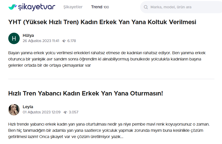 Türkiye Cumhuriyeti Devlet Demiryolları (TCDD), hızlı trenlerinde kadın ve erkek yolcuların yan yana oturma yasağını 2023 yılında yeniden uygulamaya koymuştur.
