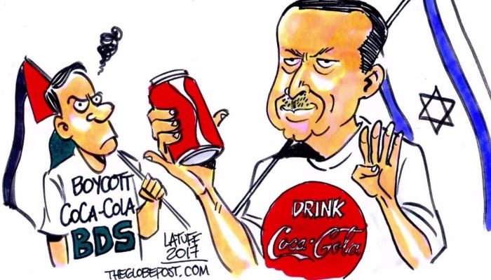Brezilyalı karikatürist Carlos Latuff'un Amerikan gazetesi The Globe Post için çizdiği karikatürde; elinde Filistin bayrağıyla Coca–Cola'yı boykota davet eden bir kişinin karşısında, Coca–Cola tişörtü, rabia işareti ve İsrail bayrağıyla Recep Tayyip Erdoğan'ın durduğu resmedildi.