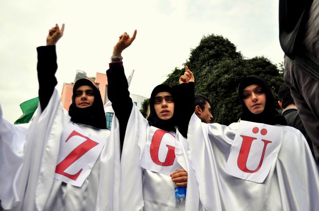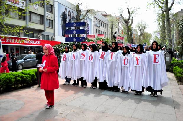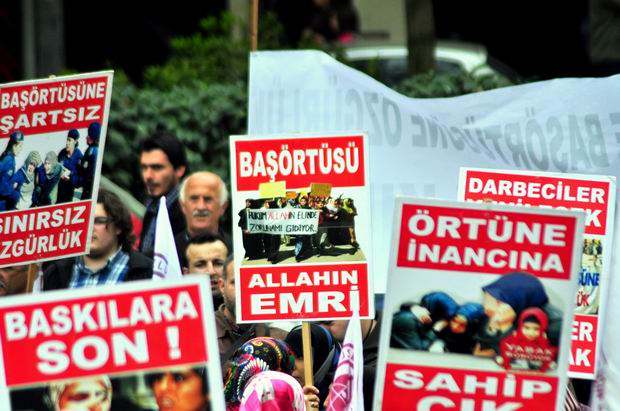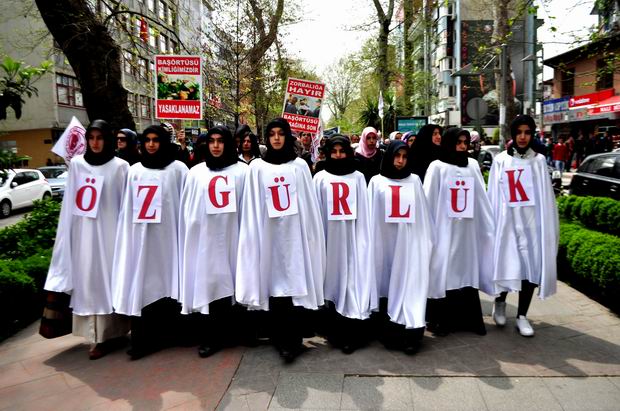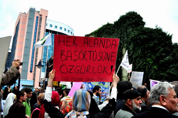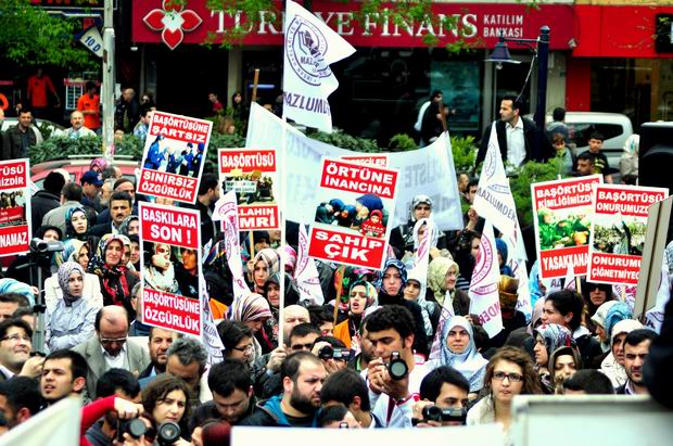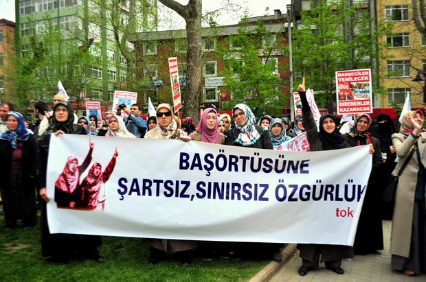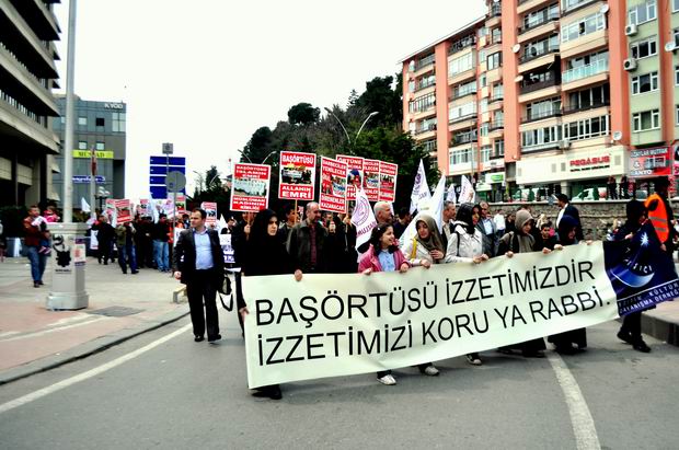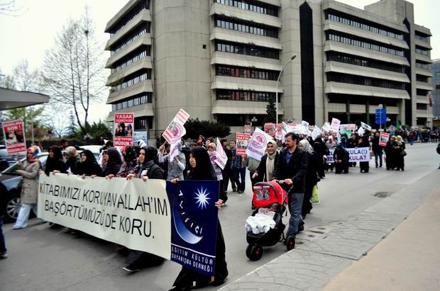 Merkez Bankası"ndan başlayan ve İnsan Hakları ve Sabri Yalım Parkı'na kadar devam eden 2000 kişilik protesto yürüyüşü boyunca , 'Uyan diren özgürleş', 'Yaşasın onurlu direnişimiz', 'Direnişe devam başörtüye selam' yazılı pankartlar dikkat çekti.