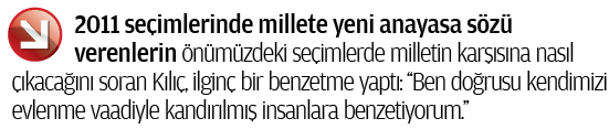 Kılıç, 2011 yılında millete yeni anayasa sözü verenlerin seçimlerde milletin karşısına nasıl çıkacağını sorarken ilginç bir benzetme yaptı: