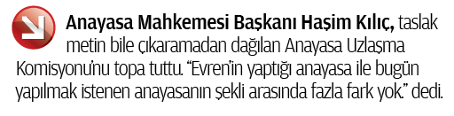 Haşim Kılıç, bir taslak bile ortaya koyamadan dağılan Anayasa Uzlaşma Komisyonu’nu da demokratik bulmadı. 1982 Anayasası’nı darbe lideri Kenan Evren ile 5 arkadaşının hazırlattığına dikkat çeken Kılıç, sözlerini şöyle sürdürdü: “Bugün itibarıyla gerçekten demokratik bir anayasanın ortaya çıkabilmesi için önce bu anayasayı yapacak olanların demokratik usullerle ve sağlam yol ve yöntemlerle oraya gelmesi lazım. Bu, kurucu meclis olabilir ya da parlamento olabilir. Şimdi 1982 Anayasası’nı kim hazırladı? Kenan Evren ve 5 arkadaşı. Cunta, darbe yaptı ve arkasından bu anayasayı hazırlayıp halka onaylattı. Bugün ne oluyor Allah aşkına? Parlamentoyu oluşturan siyasi partilerimiz anayasa yapmak için harekete geçtiler. Peki nasıl geldi bu arkadaşlar? Siyasi parti başkanlarının iradeleriyle oluşmuş milletvekillerinin oluşturduğu bir Meclis var ortada. Kenan Evren’in yazdıklarıyla bunların söylediklerinin ne farkı var Allah aşkına? Bir meclisin sağlıklı oluşabilmesi için çok ciddi bir siyasi partiler kanunu ve bir siyasi seçim kanununun hazırlanması lazım. Bunlar hazırlanacak ve bunların sonunda oluşturulacak bir Meclis’ten siz gerçek bir demokrat anayasayı üretebilirsiniz.”